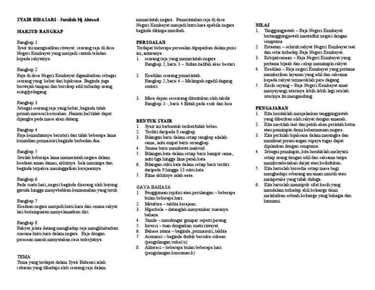 Contoh Soalan Dan Jawapan Syair Bidasari. Bilangan suku kata bagi setiap baris adalah antara 9 hingga 13 suku kata. Tujuan hikayat supaya menjadi contoh dan perbandingan kepada pembaca. Bahasa yang terdapat dalam syair di atas. Raja menitahkan pembesar membina istana.