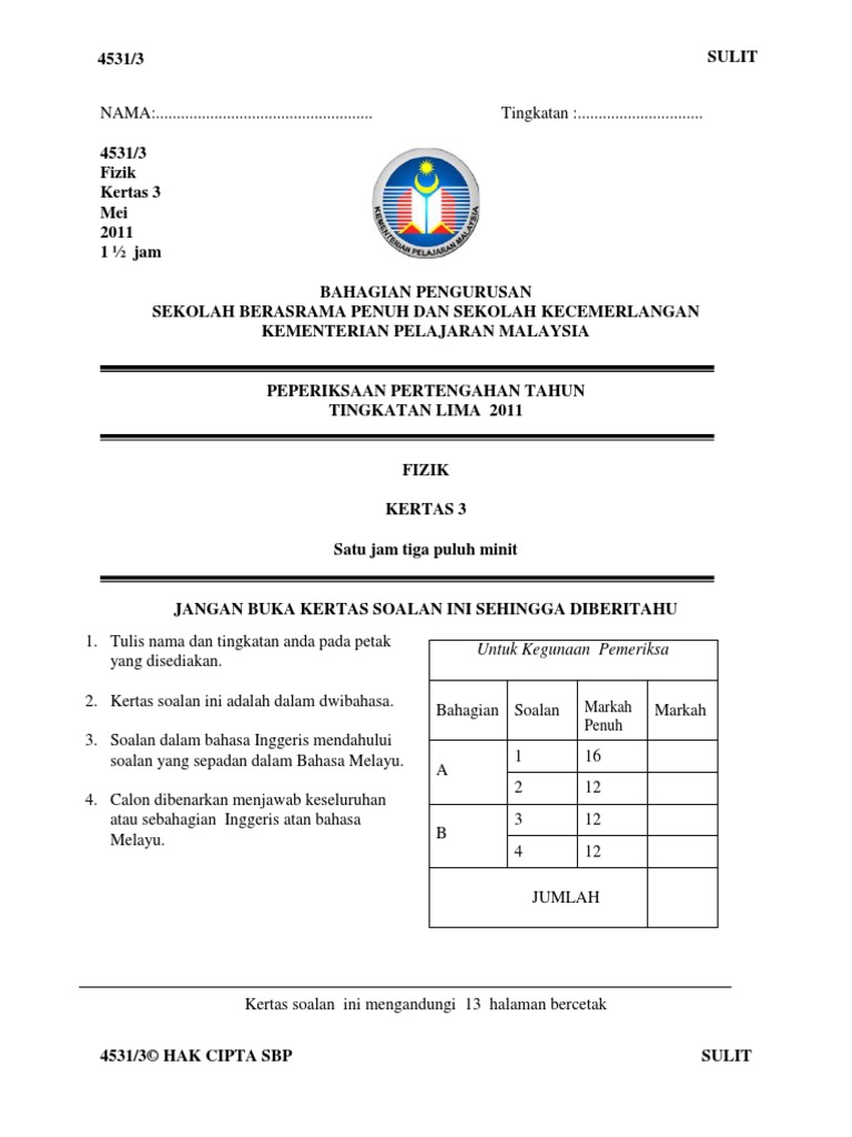Koleksi Soalan Fizik Kertas 3 Tingkatan 4. 1 hour and 30 minutes. Koleksi soalan, latihan, nota, modul fizik tingkatan 4 + jawapan. Soalan sbp fizik tingkatan 4. Related posts to soalan sejarah tingkatan 4 bab 2 kertas 3 .